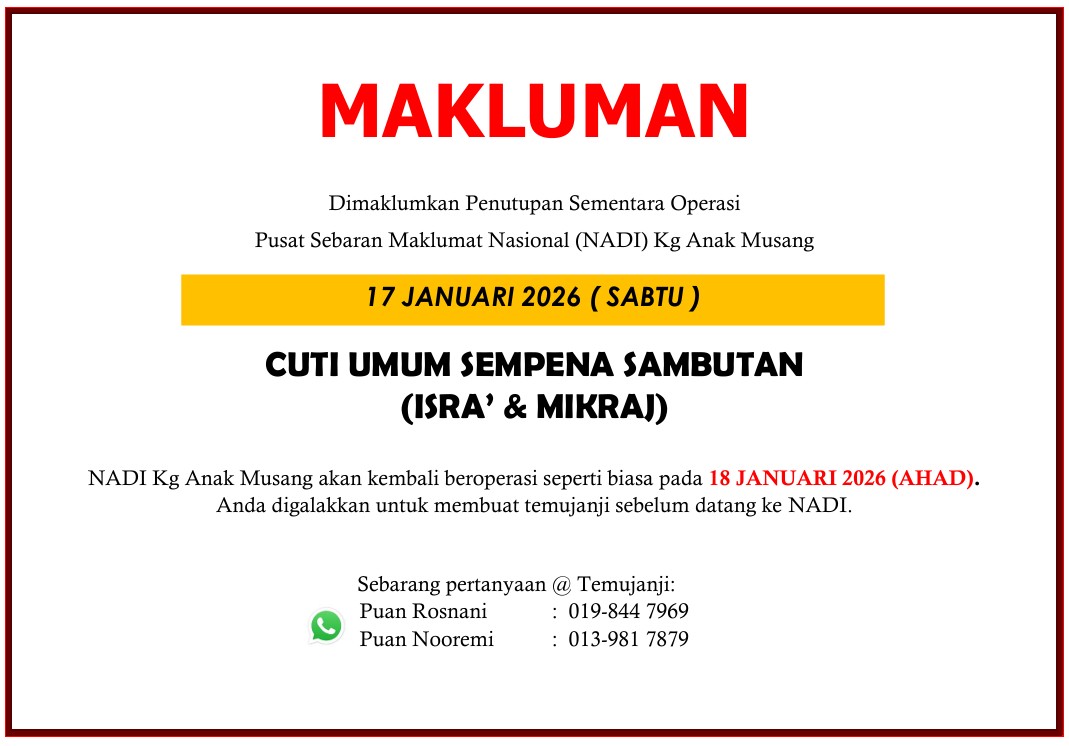TARIKH JANUARI 2026 MASA 3.00 PM – 4.30 PM LOKASI NADI KAMPUNG ANAK MUSANG PESERTA 1 Tujuan :Memberi pengenalan dan pendedahan kepada peserta tentang NADI dan menggalakkan mereka menyertai program secara percuma setelah mendaftar sebagai ahli NADI. Selain itu, bertujuan […]